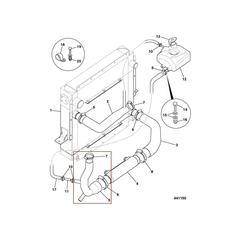 Montaggio diretto su sollevatore telescopico articolato JCB TM 300 secondo schema tecnico costruttore 441150. Installazione senza modifiche al circuito esistente, sostituzione esatta del pezzo originale. Adatto a tutti i modelli JCB TM 300 equipaggiati con circuito di raffreddamento standard. Fascette in acciaio inox raccomandate per montaggio professionale.
