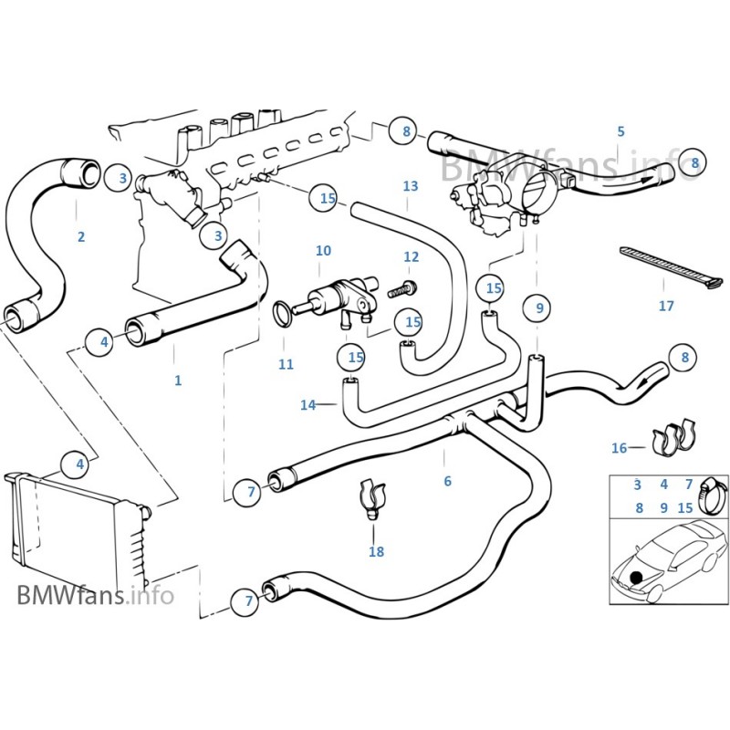 I manicotti originali sostituiti da questo kit portano i seguenti riferimenti OEM: manicotto superiore radiatore 11531720720, manicotto inferiore radiatore 11531730928, manicotti riscaldamento 11531738055 e 64211394293, manicotti preriscaldamento farfalla 13541735174 e 13541735173. Questi riferimenti BMW si applicano alle E36 325i M50B25 prodotte tra settembre 1990 e dicembre 1995 per il mercato europeo.